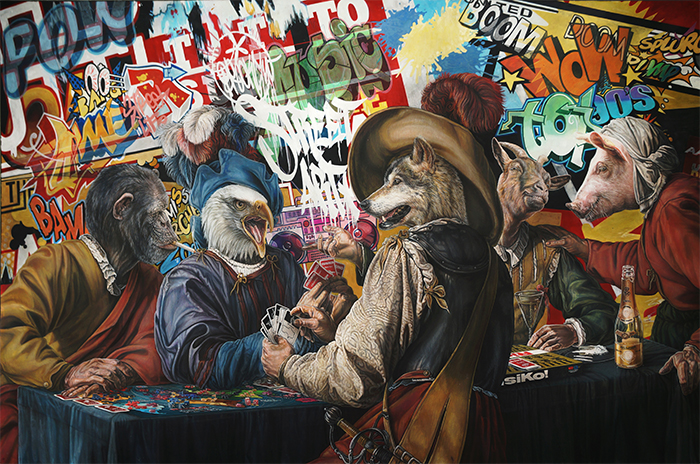 Le figure che popolano le tele di Unia, pur attingendo a un ampio repertorio di riferimenti visivi, vengono distillate in una sorta di linguaggio universale che collega il passato al presente. Attraverso l'uso di scritte, stencil, lettering e segni grafici che richiamano l'epoca della pop art, l'artista crea un ambiente visivo denso di significato, in cui il dialogo tra storia e contemporaneità si fa palpabile.