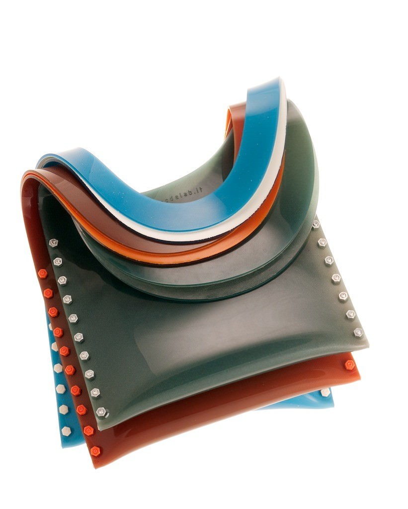 Elemento trainante è una borsa fatta interamente a mano seguita da una linea di oggetti in resina del tutto originale,