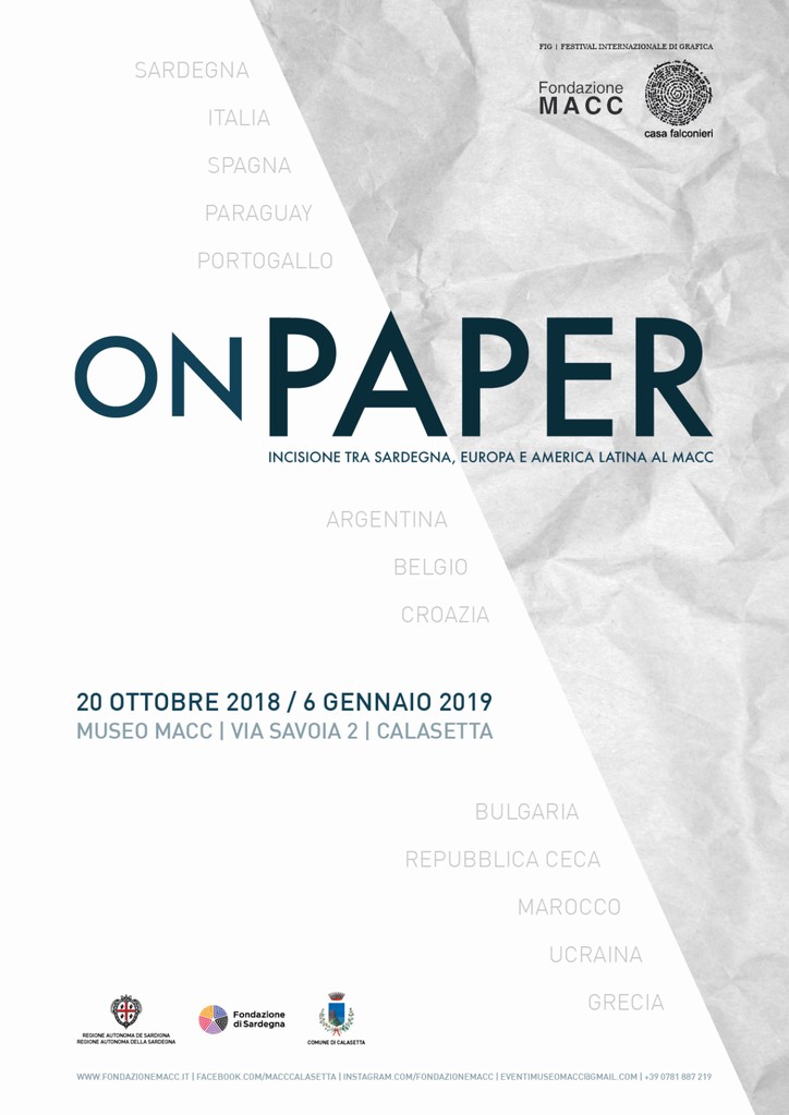 Casa Falconieri, Centro di Sperimentazione e Ricerca attivo a livello internazionale nella promozione e valorizzazione delle arti grafiche, ha scelto il museo MACC, in accordo col direttore Efisio Carbone e la Fondazione MACC, come sede della rassegna internazionale ON PAPER, portando a Calasetta opere e artisti nei mesi di ottobre – gennaio per un simposio sull’incisione contemporanea che estende e arricchisce la stagione espositiva del museo anche in mesi notoriamente più difficili da destinare a un’ampia utenza. L’esposizione è per il museo un momento di riflessione dedicato al principale “medium” della propria collezione permanente: la carta. È inoltre un omaggio alle pratiche incisorie di cui Ermanno Leinardi, fondatore del museo MACC e donatore della collezione, fu maestro indiscusso ottenendo importanti riconoscimenti a livello nazionale e internazionale.