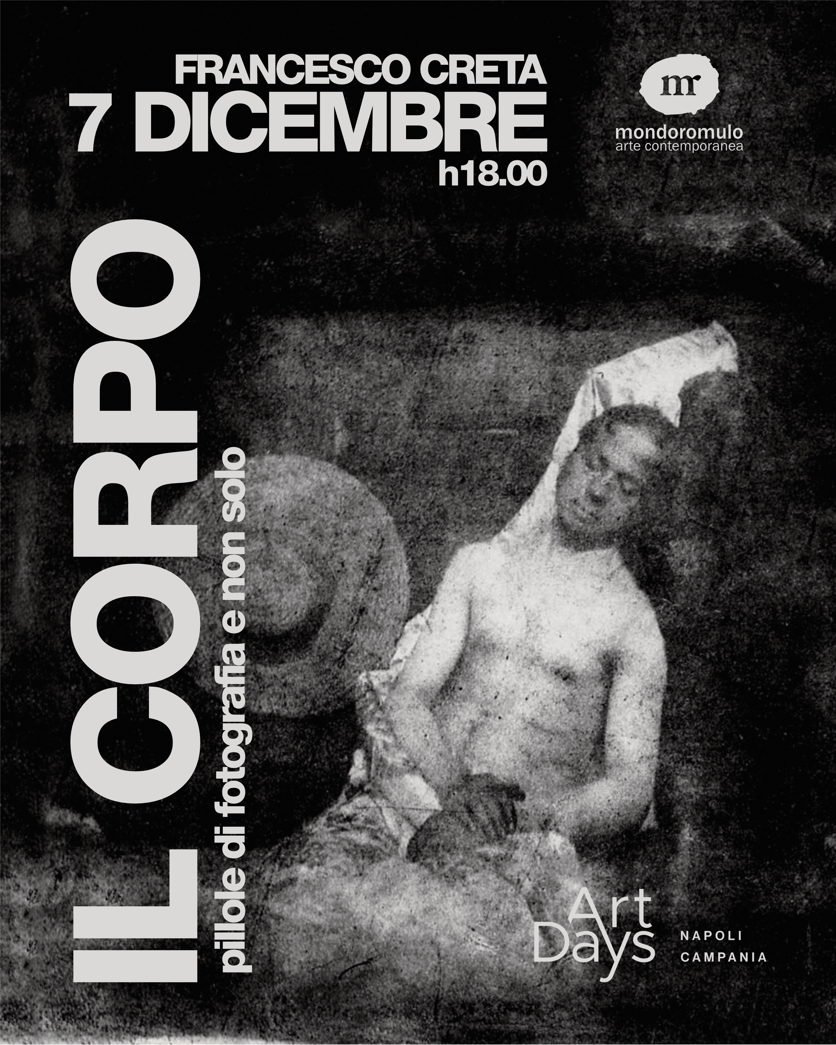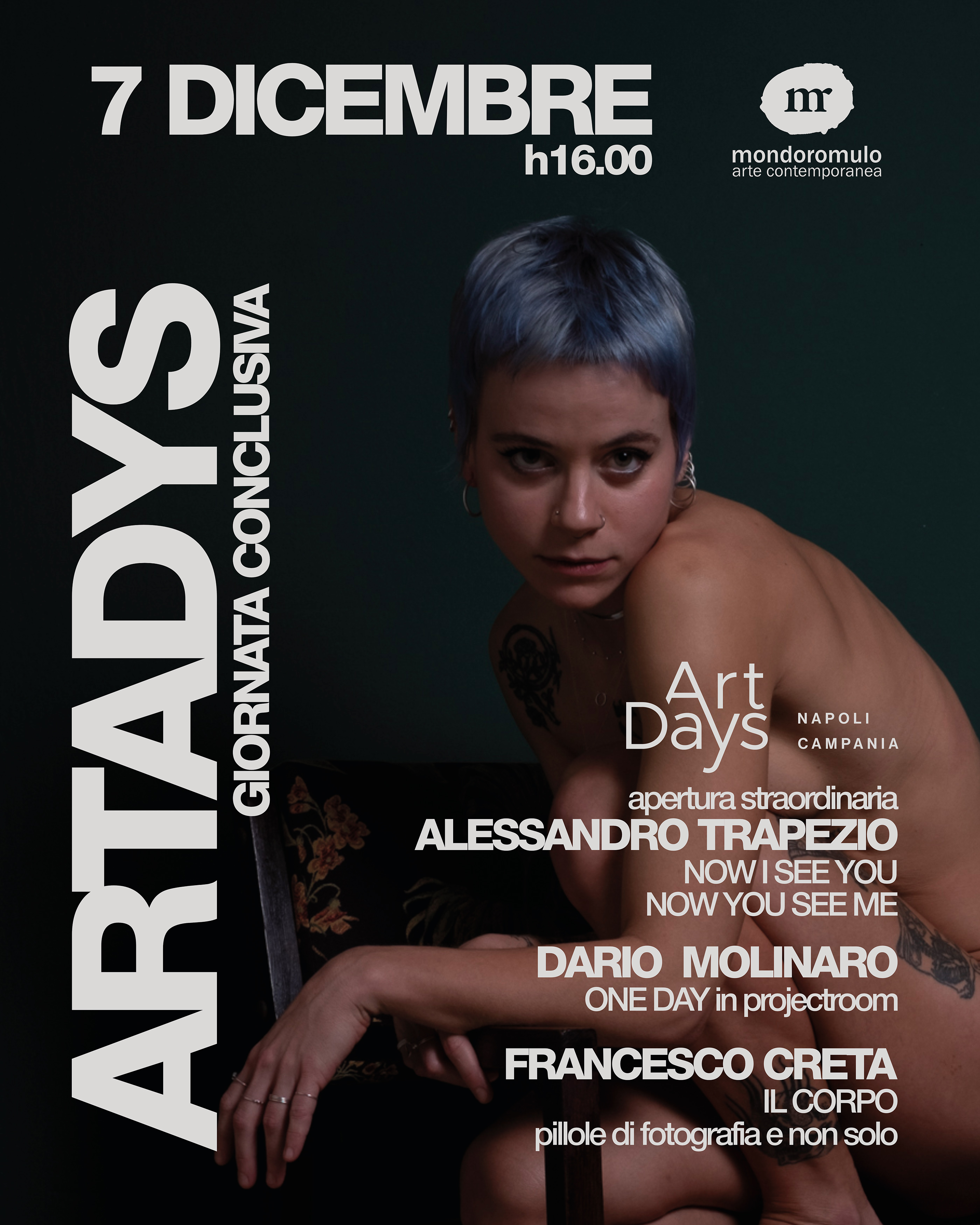 Per la giornata conclusiva degli ArtDays Napoli Campania la galleria propone tre appuntamenti: • Now I se you, now you see me di Alessandro Trapezio; Oneday in projectroom di Dario Molinaro; Il Corpo, pillole di fotografia e non solo, di Francesco Creta.