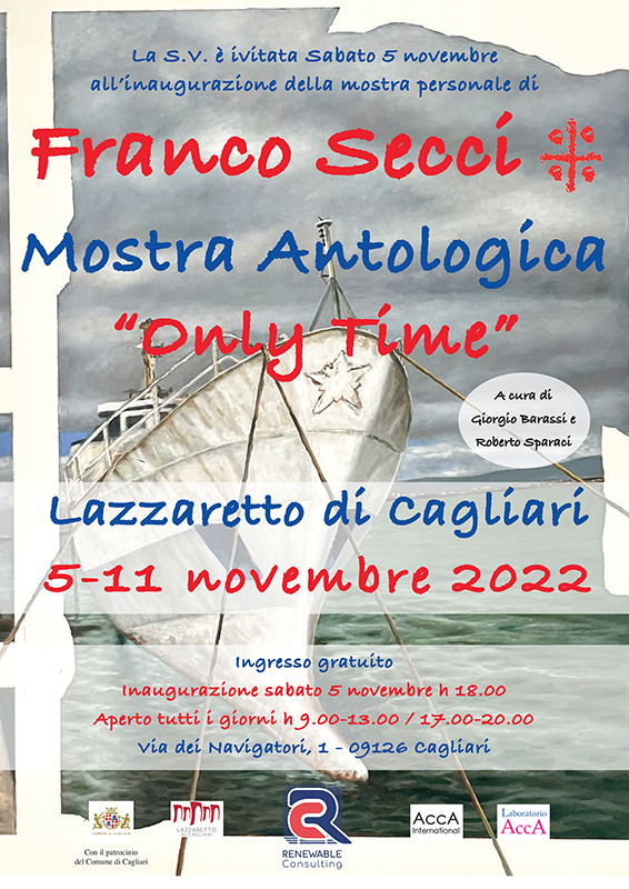 Nella maestosa Sala degli Archi del Lazzaretto di Cagliari si inaugura il 5 novembre 2022 la mostra ONLY TIME, antologica del pittore Franco Secci, figlio del territorio cagliaritano. La mostra, patrocinata dal Comune di Cagliari, racconterà tutti gli anni delle esperienze di Secci, raccogliendo opere dei suoi diversi cicli produttivi che lo hanno consacrato oggi come artista dalle note di grande classicità accompagnate a sperimentazioni moderne ed avveniristiche. Secci, predisposto alla pittura sin da giovanissimo, cresciuto artisticamente sotto l’ala del Maestro Antonello Pintus, ha sfoderato negli anni della sua evoluzione una padronanza tecnica notevole, e ha accompagnato la sua conoscenza della pittura a fortunati esperimenti digitali come le attuali Tessere, unite dal formato comune (cm. 50 x 50) e dedicate a personaggi mondiali della storia, dello sport, della musica e in particolare della tradizione sarda.
