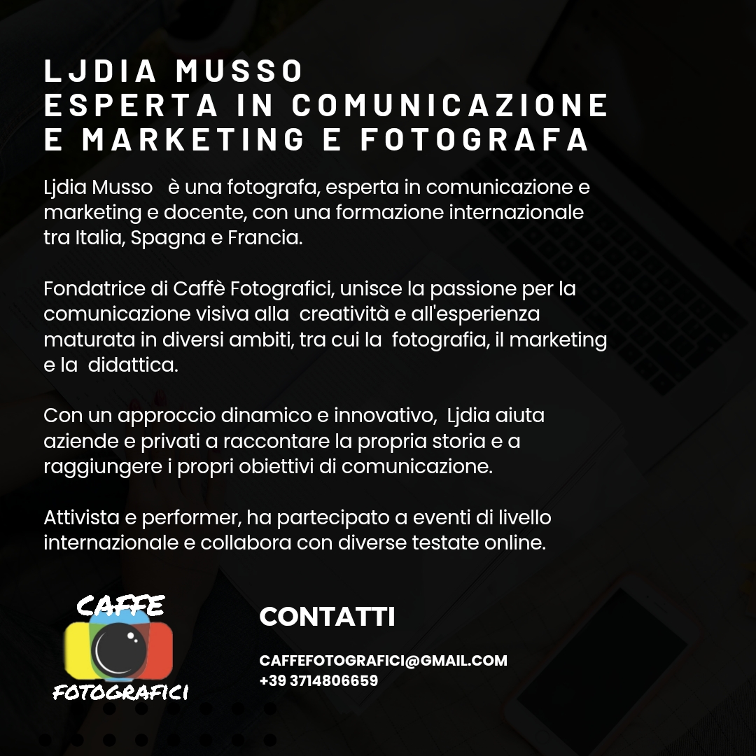 L'Open Day sarà un'occasione per conoscere Ljdia Musso, scoprire i corsi di Caffè Fotografici, visitare la mostra e confrontarsi con altri appassionati di fotografia.