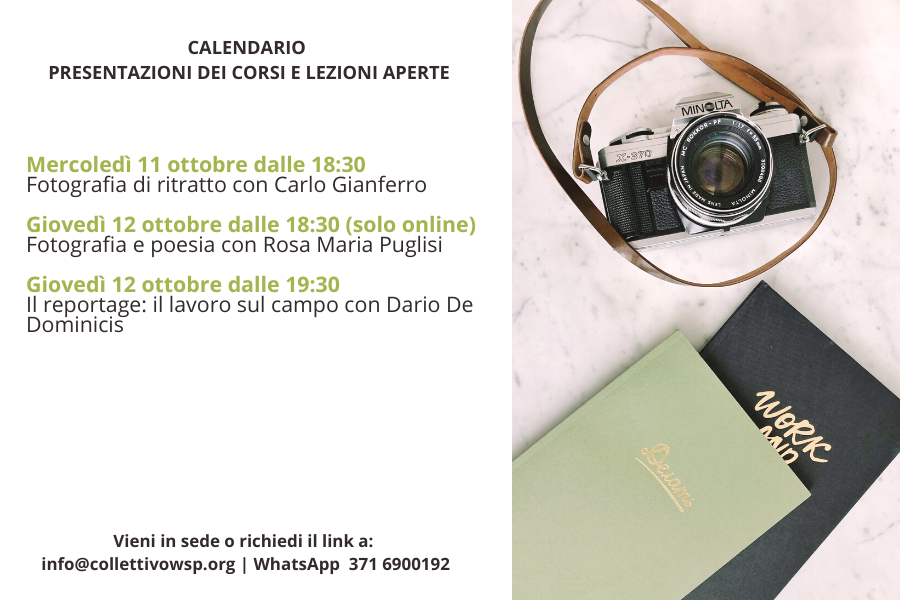 Dal 3 al 12 ottobre si terranno i nostri Open Days per farvi conoscere la nostra scuola di fotografia e i nostri corsi di fotografia in partenza da metà ottobre 2023.