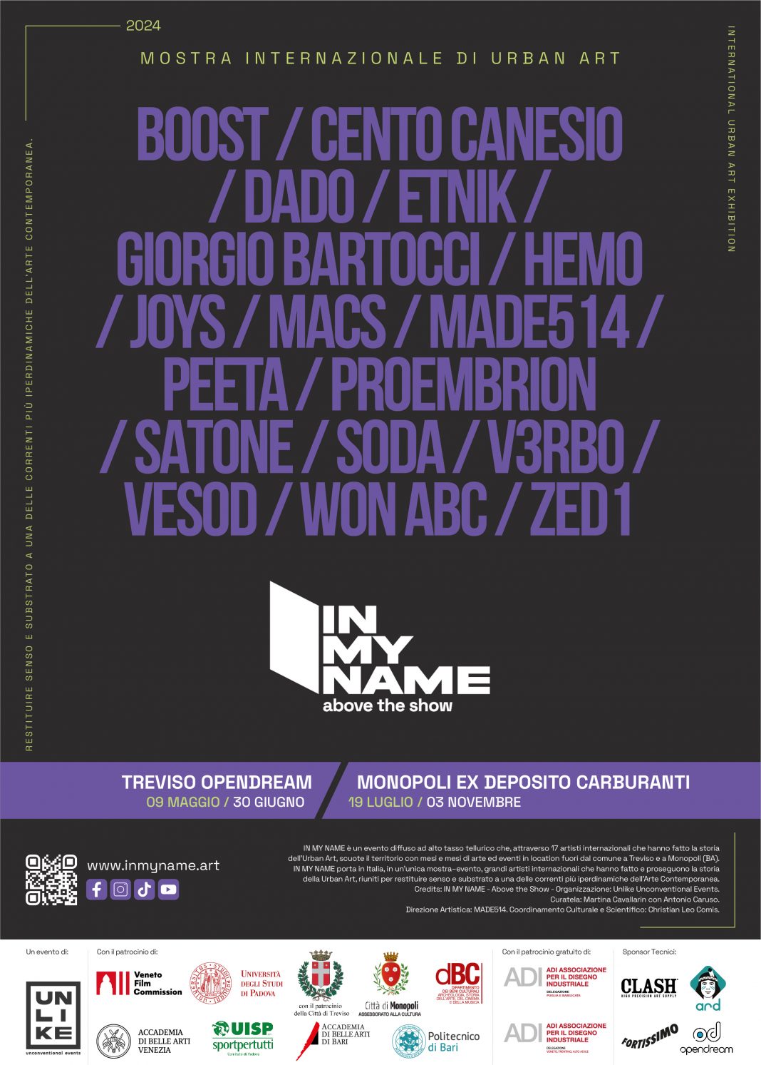 Una grande mostra-evento internazionale che celebra la storia e traccia l’evoluzione dell’Urban Art, una delle correnti più iperdinamiche dell’arte contemporanea. Dal 9 maggio al 30 giugno a Treviso e dal 19 luglio al 3 novembre 2024 a Monopoli (BA), arriva IN MY NAME. Above the show.