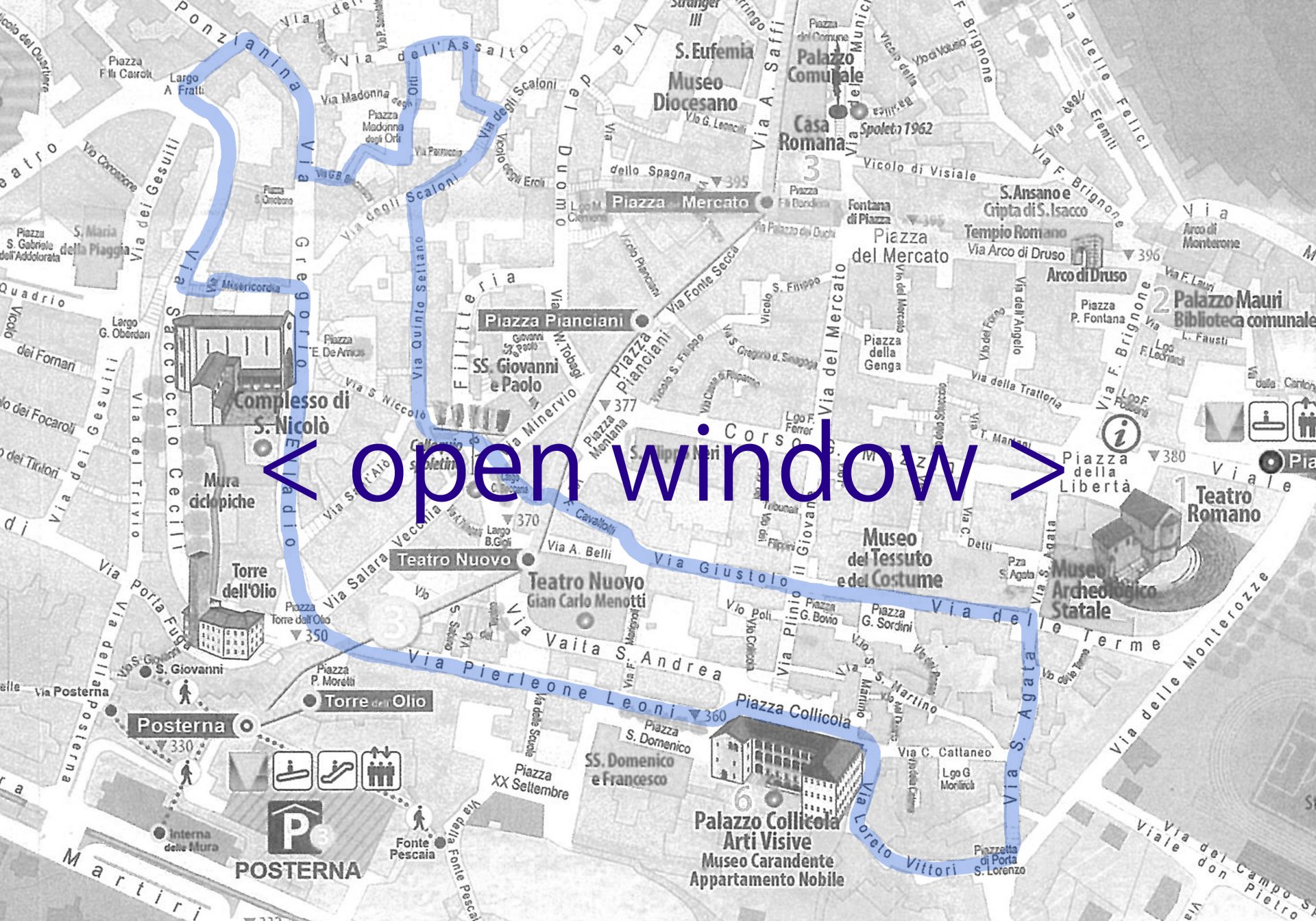 Per la seconda edizione di open window, il pubblico è invitato a seguire un preciso percorso attraverso le vie e le piazze anche meno conosciute del centro storico di Spoleto, alla scoperta delle opere sonore di dieci artisti che potranno essere sentite durante tutta la durata dell’evento.