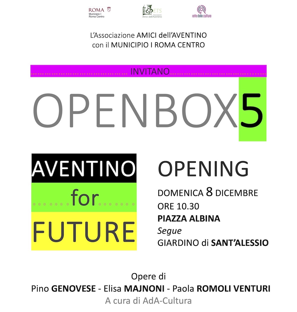 Con AVENTINO for FUTURE si giunge alla quinta edizione di OPENBOX, un progetto espositivo dell’Associazione Amici dell’Aventino*ETS, promosso con il Municipio I Roma Centro, che persegue le finalità statutarie di AdA* di custodia e valorizzazione dei luoghi del colle.
