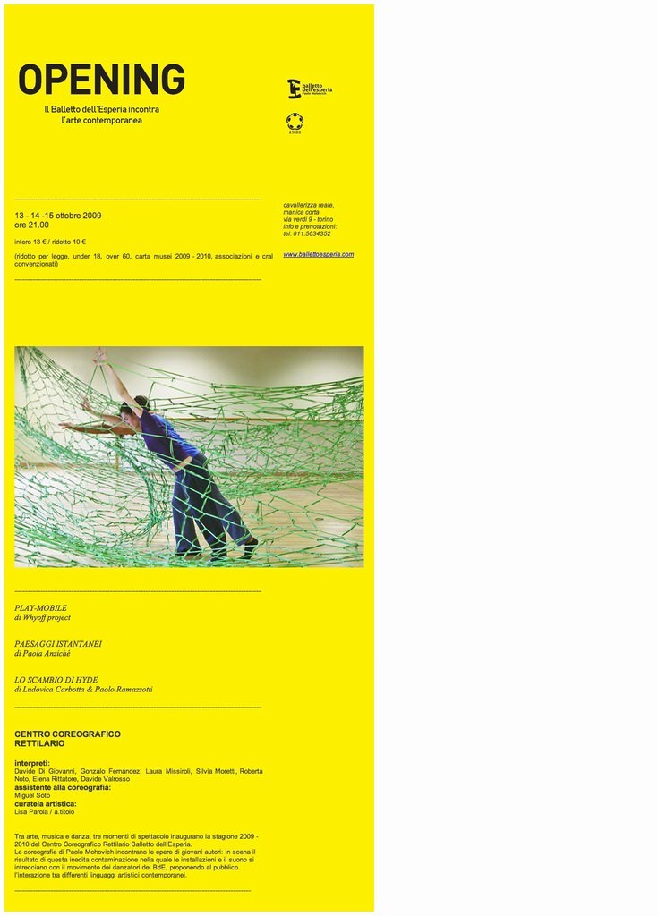 Opennig è nell’ambito di PALCOSCENICO DANZA, la stagione di danza 2009-2010 del Centro Coreografico Rettilario / Balletto dell’Esperia, che si svolgerà a Torino al Teatro Astra (via Rosolino Pilo 6) e alla Cavallerizza Reale (via Verdi 9) e che anche quest’anno è ospitata nel cartellone teatrale della Fondazione Teatro Piemonte Europa.