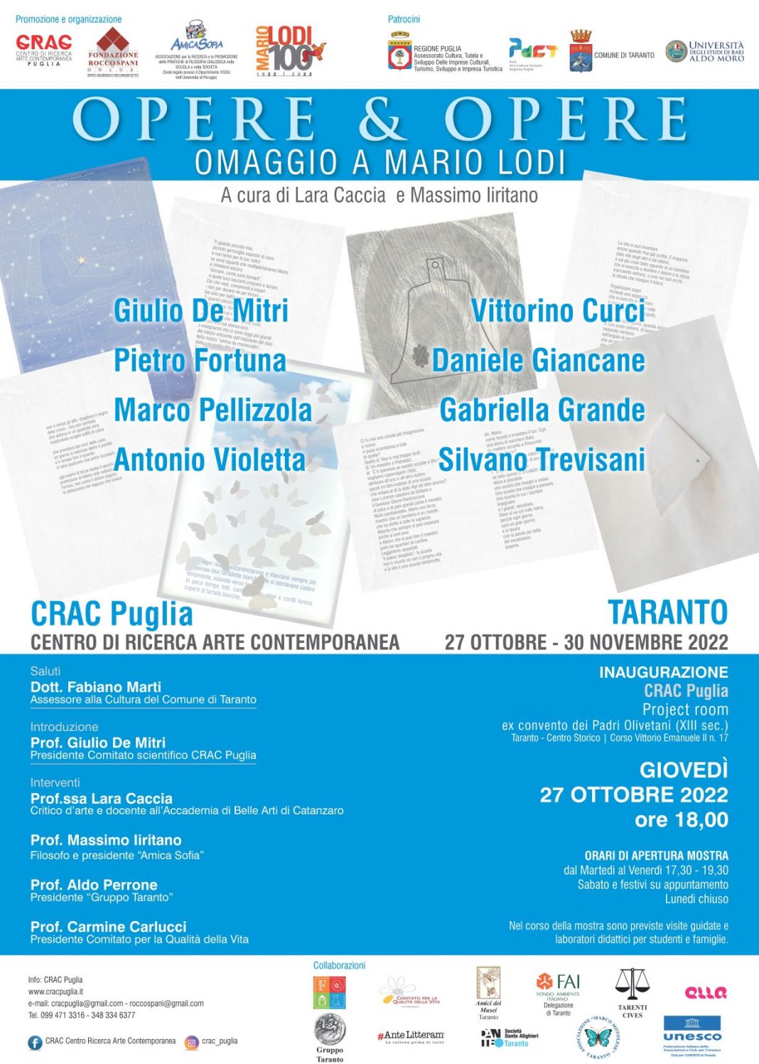 Alla serata inaugurale interverrà l'Assessore alla Cultura del Comune di Taranto dott. Fabiano Marti, i curatori proff. Lara Caccia, storica e critica d'arte, Massimo Iiritano, filosofo e presidente dell'Associazione Amica Sofia, prof. Aldo Perrone, già dirigente scolastico e presidente del "Gruppo Taranto", e prof. Carmine Carlucci, presidente del Comitato per la Qualità della Vita. Introdurrà e modererà l'incontro il prof. Giulio De Mitri, presidente del Comitato Scientifico del CRAC Puglia. Saranno presenti all'evento gli artisti e i poeti.