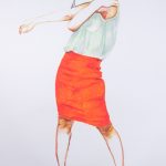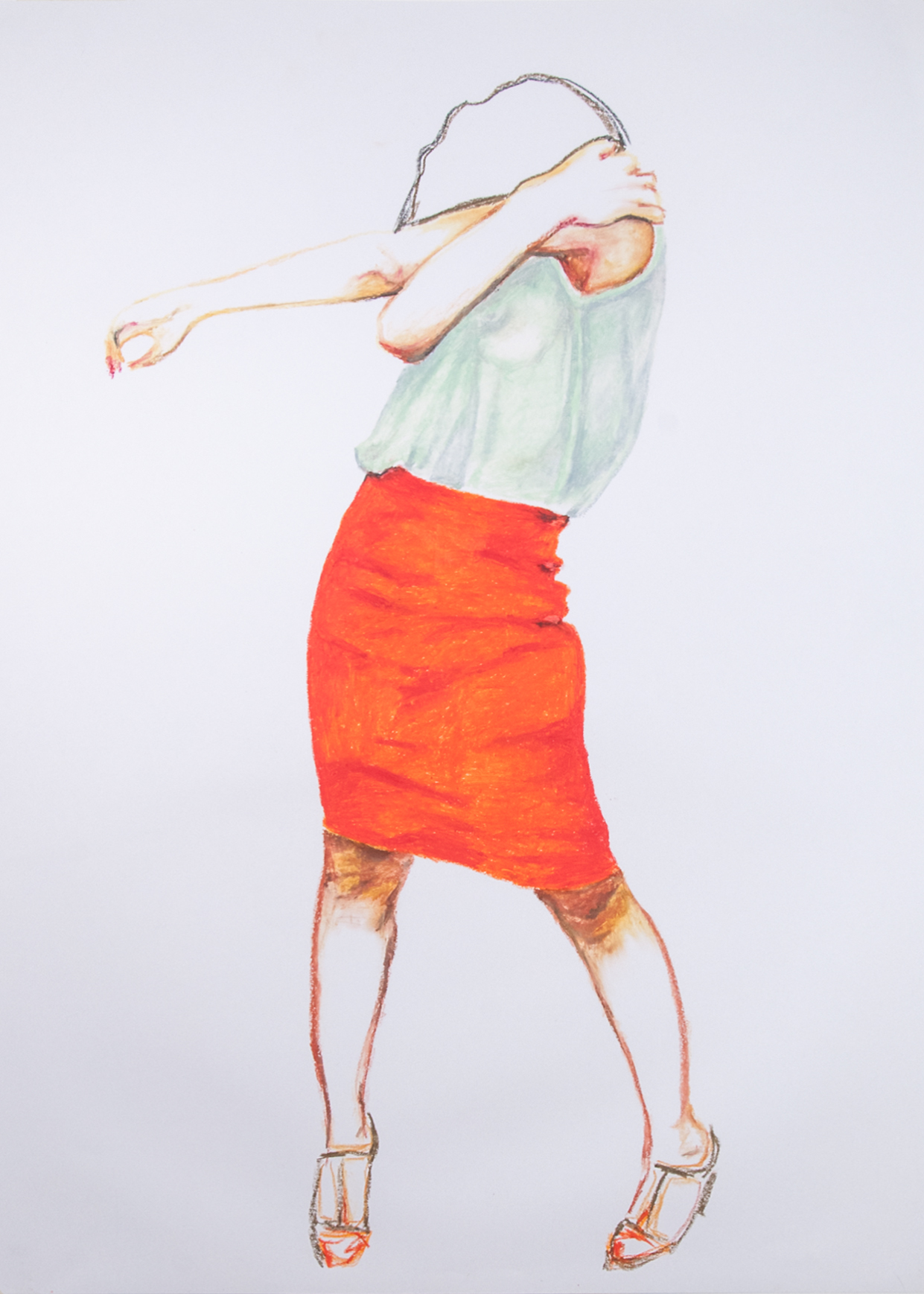 Su questa linea si pone ad esempio la proposta di Antonia Bufi. Con pastelli a cera su carta aggraziate figurine femminili in pose domestiche sono tratteggiate nei dettagli e colorate solo in parte, con volti e frammenti di corpo vuoti, scontornate sul fondo bianco e impegnate in strane e un po’ buffe contorsioni. “Un dinamismo del corpo, dettato da movimenti interiori, trasforma l’irrequietezza dell’anima”, annota l’autrice. Confermando il rapporto che lega qui interno ed esterno, In e out come s’intitola la serie, sè e gli altri.