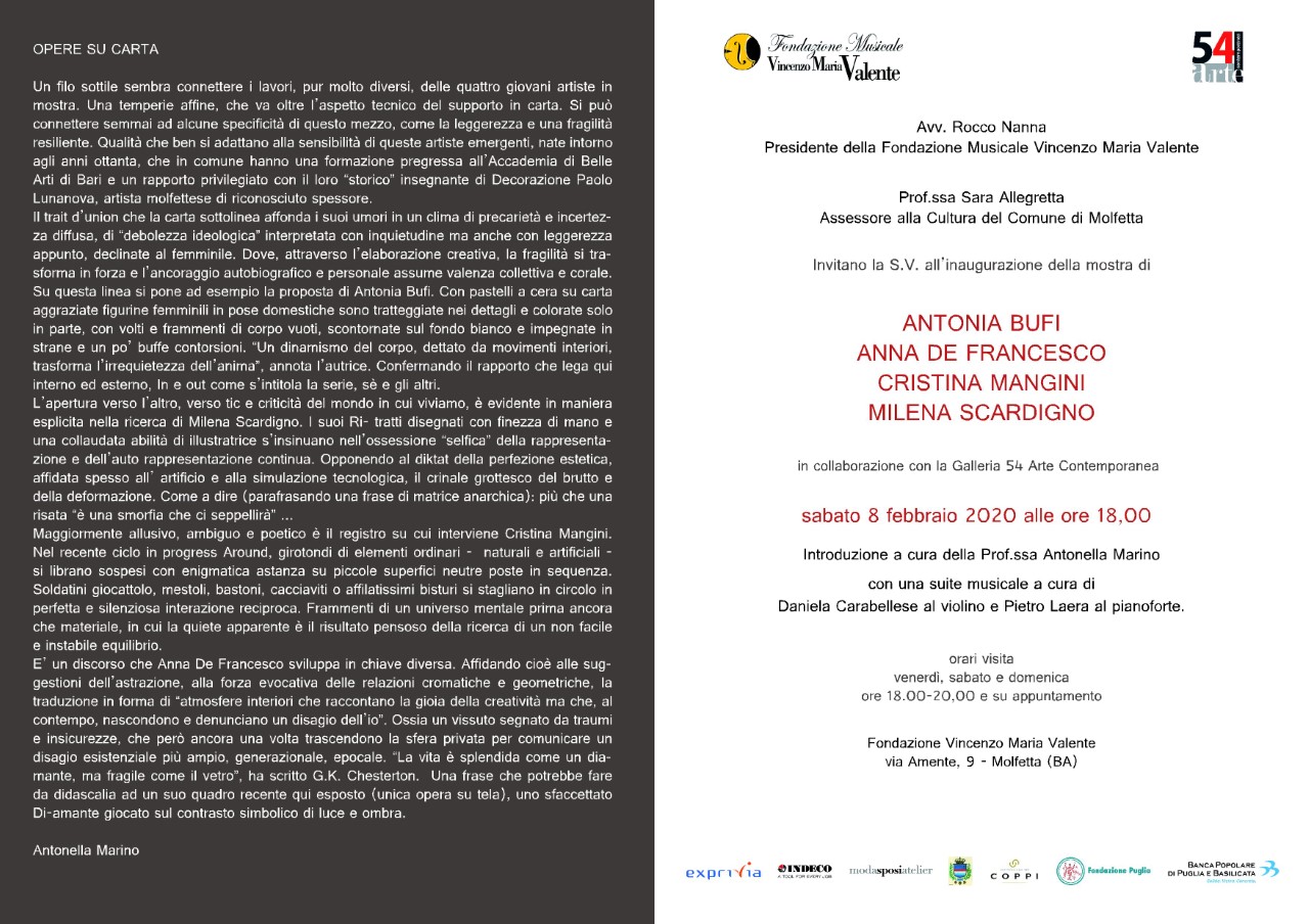 La Fondazione Vincenzo Maria Valente in collaborazione con la Galleria 54 Arte Contemporanea, presenta Opere su carta, mostra di Antonia Bufi, Anna De Francesco, Cristina Mangini e Milena Scardigno: artiste emergenti, che in comune una formazione pregressa all’Accademia di Belle Arti di Bari.