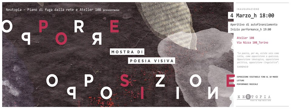 Si svolgerà da sabato 4 marzo 2017 con inaugurazione dalle ore 18,00, presso l'Atelier_108 di Cecilia Gattullo e Piera Romeo, in Via Nizza 108 a Torino, "OPPORRE OPPOSIZIONE - Mostra di Poesia Visiva", esposizione assai interessante che potrete visitare in atelier sino al 10 marzo. (Link all'evento fb https://www.facebook.com/events/166775657158793/?ti=cl )
