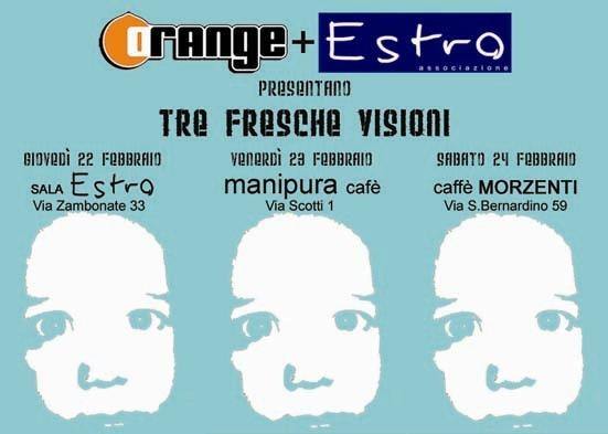 Il secondo evento dal titolo TRE FRESCHE VISIONI si apre Giovedì 22 febbraio 2007, nella sede dell’Associazione in Via Zambonate 33, con il contributo dell’Associazione Generale di Mutuo Soccorso di Bergamo. Il progetto nasce da una collaborazione con l’Associazione Culturale Orange, presente da qualche anno sul territorio e promotrice di diverse manifestazioni artistiche e culturali che propone un grande evento costituito da tre mostre parallele, ospitate oltre che nello SPAZIO ESTRO in due locali bergamaschi (il MANIPURA cafè ed il Caffè MORZENTI n.d.a.) a poche centinaia di metri di distanza fra loro e tutti ad ingresso gratuito.