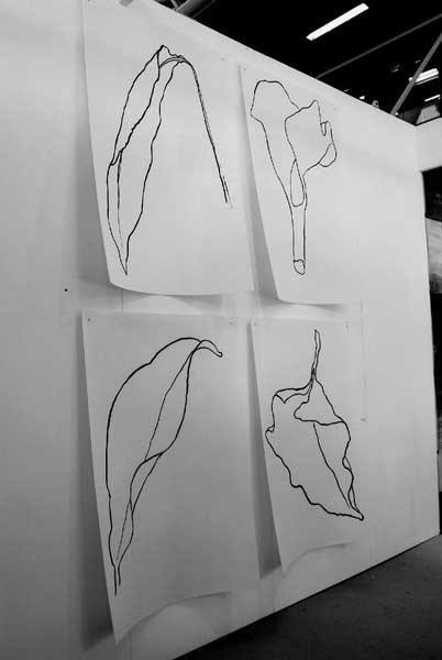 Da qualche tempo a questa parte l’interesse di Pinuccia Bernardoni (1953) è incentrato principalmente sul disegno. Una pratica che si sviluppa nella tensione a dare tridimensionalità al disegno. Disegno antropomorfico in cui lei stessa con il suo corpo è modulor. Il grande pastello con cui traccia il segno sulla carta velina funziona come un bulino morbido. Il suo è un rapporto fisico, intenso, sensuale con la materia e con il supporto. Il soggetto, per certi versi ossessivo, sono le foglie, che si trasformano sino a cancellare il punto di partenza.