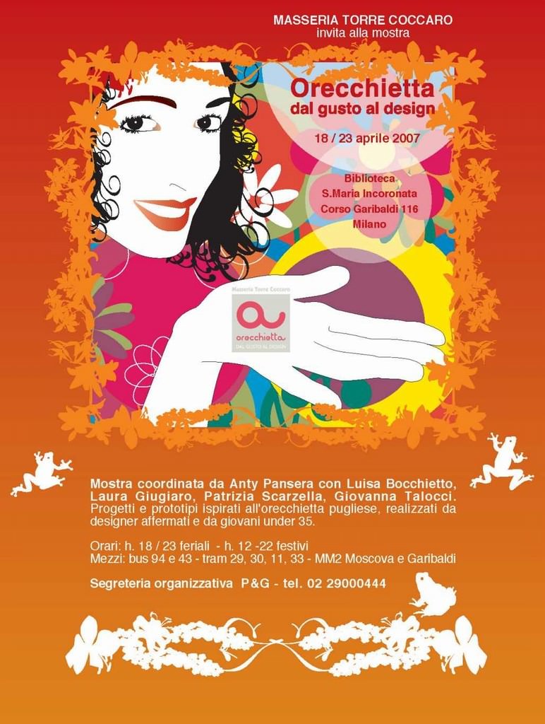 Quattro professioniste di successo coordinate dalla storica del design Antv Pansera: Luisa Bocchietto, Laura Giugiaro, Patrizia Scarzella, Giovanna Talocci. Uno stuolo di oltre settanta designer, la metà dei quali sotto i 35 anni. Tutti pazzi per l’orecchietta. Sì quella pugliese, pasta versatile in cucina e adesso anche nella fervida immaginazione di creativi italiani che hanno messo le loro proposte sul tema in una mostra veramente singolare: “Orecchietta dal gusto al design” dal 18 al 23 aprile, a Milano, nel “Fuori Salone 2007” . Sorprendente anche la location dell’evento, la Biblioteca di Santa Maria Incoronata in corso Garibaldi 116, gioiello del ‘400 sconosciuto ai più, che la promotrice di questo kermesse di idee, Rossana Muolo, titolare della Masseria Torre Coccaro a Savelletri di Fasano (Puglia), propone all’attenzione dei visitatori per promuovere in un modo nuovo la propria attività alberghiera.