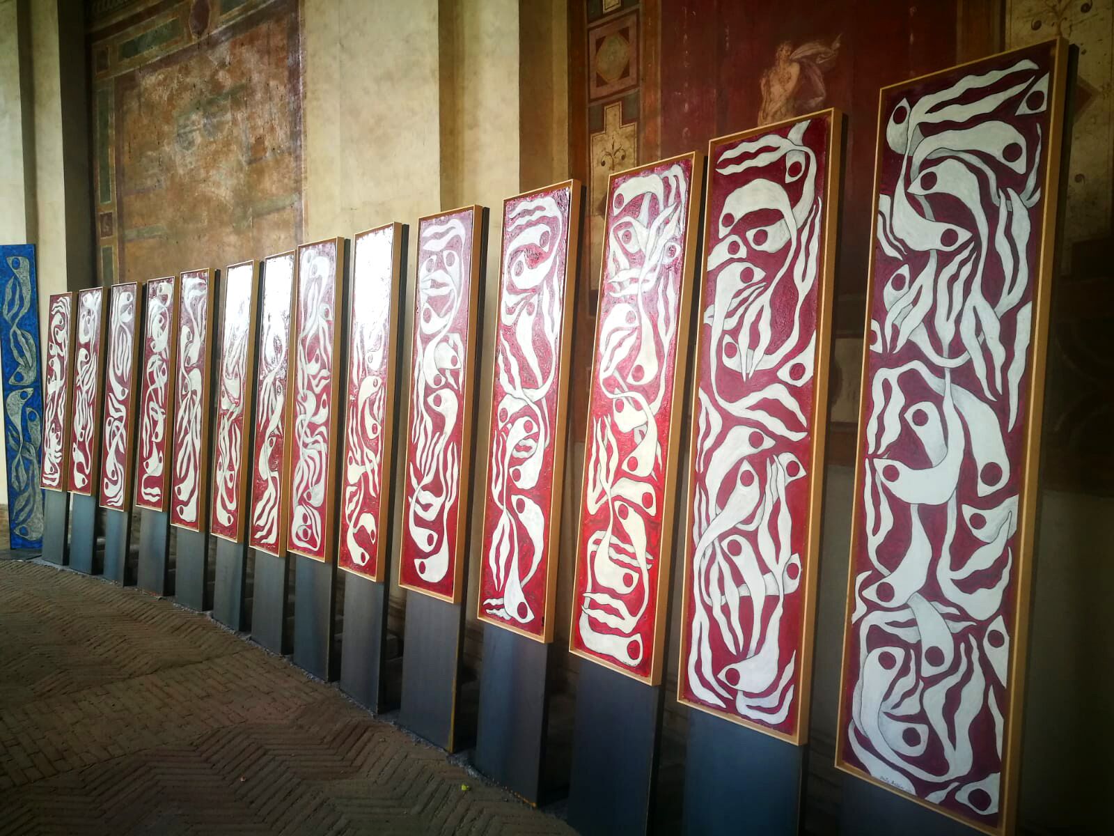 Ecco allora che nel percorso espositivo si ergono opere verticali che, con la loro preghiera silente, invocano una risoluzione al preoccupante aumento della temperatura delle acque, tema reso cromaticamente con il rosso, colore/immagine di molte opere proposte in mostra, cui si contrappone con forza il blu evocativo della purezza dell’elemento acqua.