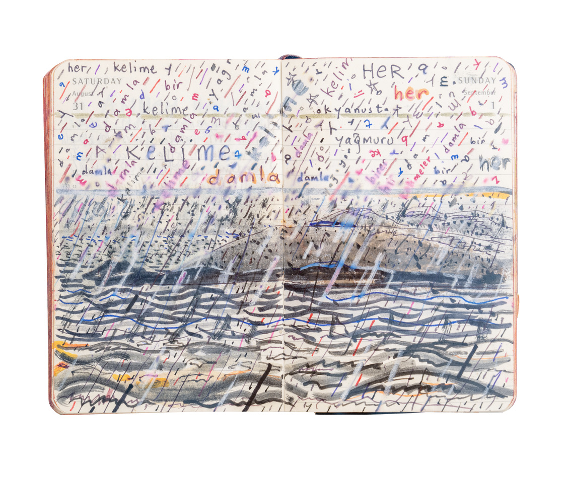 La conoscenza di Orhan Pamuk della tecnica del disegno è profonda, così come profondo è il ragionamento sugli artisti del passato, che conosce bene. Molte volte da scrittore ha ribadito il suo apprezzamento verso artisti come Anselm Kiefer, Raymond Pettibon, Cy Twombly, verso i quali da disegnatore ha mostrato il suo debito. In tutti questi casi il gesto e spesso la parola diventano elementi fondamentali della composizione, anche nella raffigurazione di un paesaggio o di un ambiente. Cascate di parole, composizioni di onde, di colori, di suoni, linee e punti, lettere…