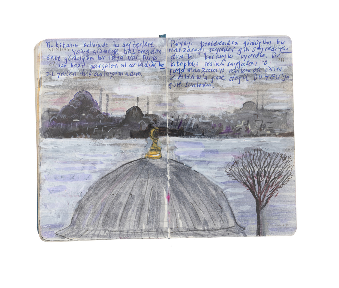 “Vorrei scrivere sulla mia felicità di coprire di testo un disegno” scrive Pamuk, “ecco che cosa va detto: fra i 7 e i 22 anni ho creduto che sarei stato un pittore. A 22 anni il pittore in me è morto e ho cominciato a scrivere romanzi. Nel 2008 sono entrato in un negozio per uscirne con due sacchetti pieni di matite e pennelli, poi ho cominciato a disegnare su piccoli taccuini, fra il piacere e il timore”.