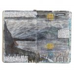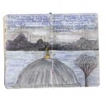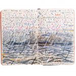 Le prime tra queste sue illustrazioni risalgono al 2009; le ultime sono di quest’anno, perché la sua produzione grafica continua ininterrotta ogni giorno. Le pagine dei taccuini sono piccoli capolavori in cui si alternano poesia visiva, atmosfere oniriche e note di viaggio “filtrate” dal suo mondo interiore. La sua esigenza di scrivere e disegnare insieme, che affolla spesso il medesimo (limitato) spazio di pagina vuota, è la premessa di questa sua istintiva pratica artistica, nella quale letteratura, pensiero e disegno si completano.