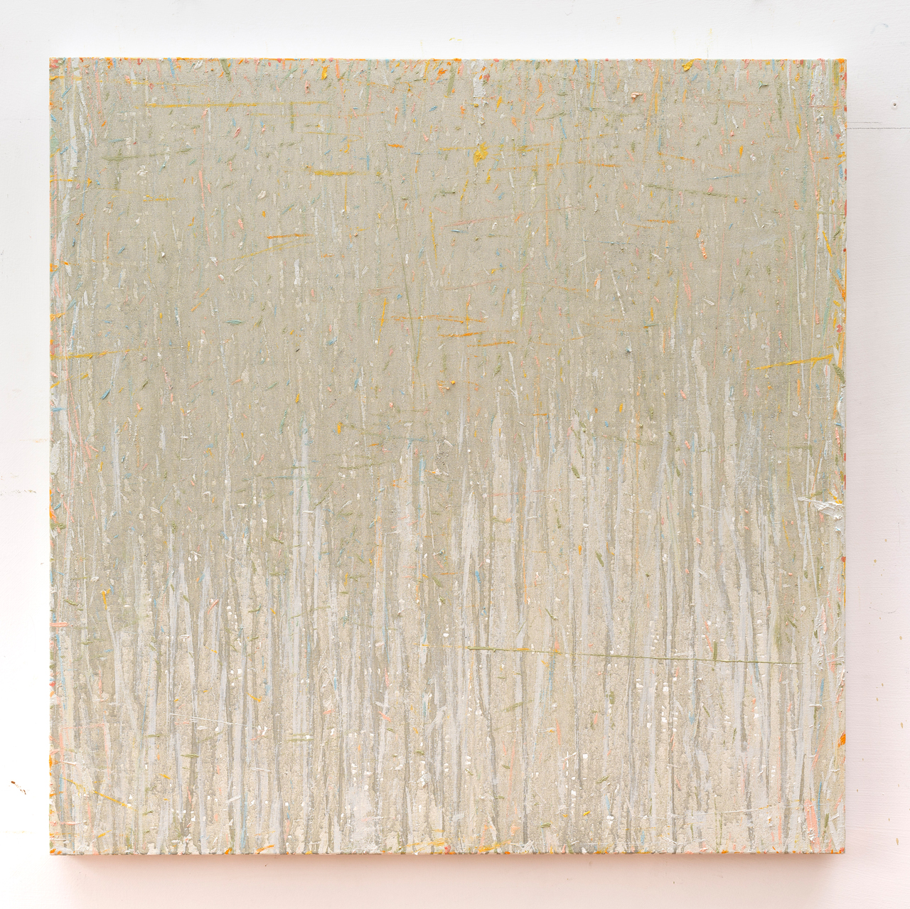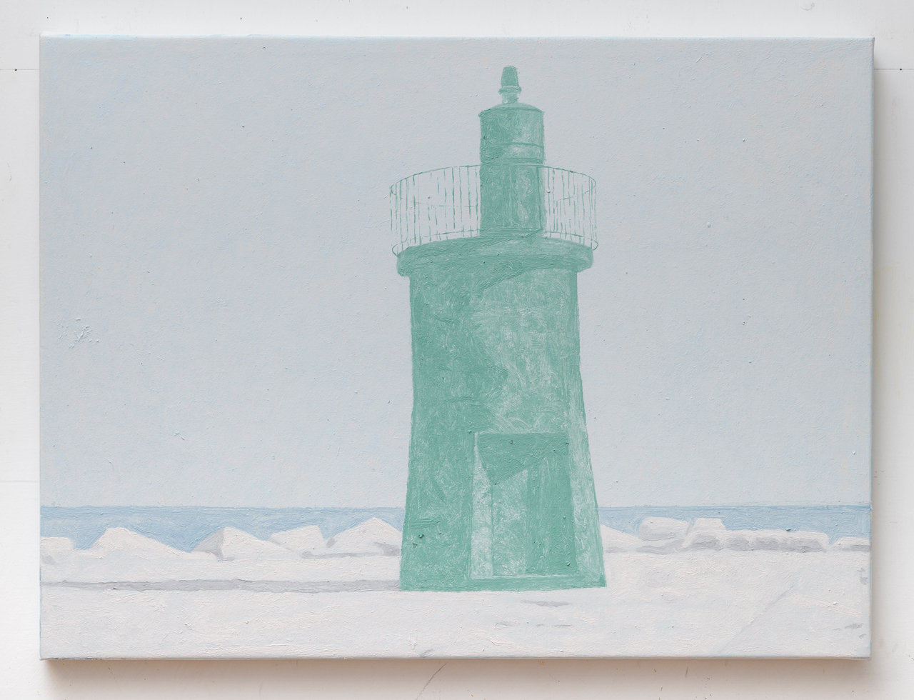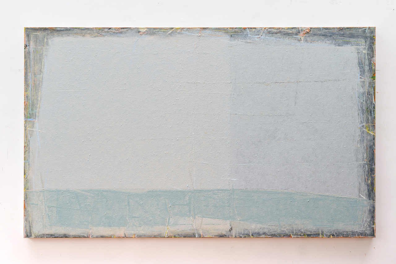 Nella sua pittura salina, il paesaggio lentamente svapora. La linea d’orizzonte sembra estendersi in un infinito ovattato, “la vastità dell’orizzonte nella sua monotonia non è che un fondale dove depositare il pensiero” commenta Elisa Fulco.
