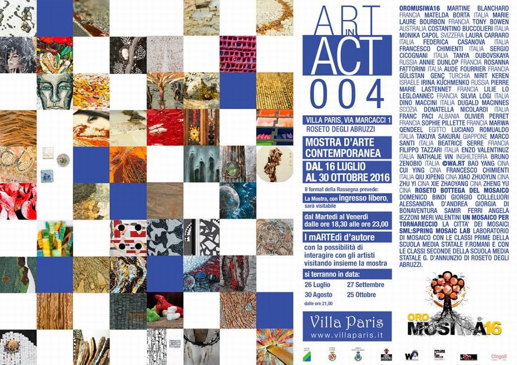 “Oro Musiwa 16” a Villa Paris di Roseto degli Abruzzi, si inaugura, sabato 16 luglio, alle ore 18:30, la mostra internazionale dedicata al mosaico contemporaneo. Molte le novità di questa seconda edizione, con una serie di sezioni speciali, che accompagneranno l’esposizione dei lavori di ben 35 artisti, in rappresentanza di 13 Nazioni.