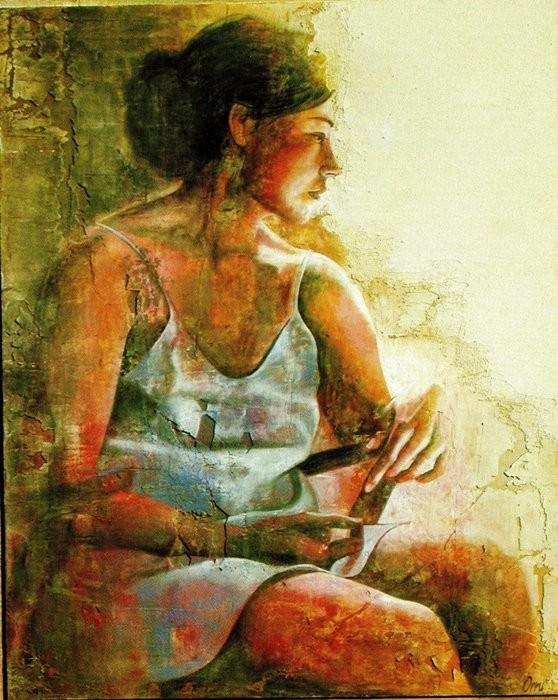 La sua è una pittura di immagine, nudi, corpi, volti di donna, spesso intercalati con decorazioni, vasi antichi, nature morte e paesaggi. Un gioco di trasparenze e “graffi”, un equilibrio di rapporti volumetrici e luministici, che danno vita a composizioni cariche di suggestione, raccoglimento mistico, a volte pervase da un sottile erotismo.