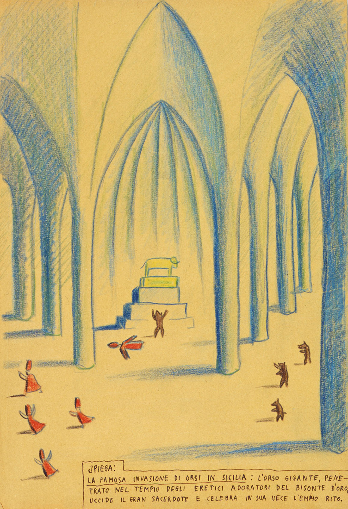 Il romanzo "La famosa invasione degli orsi in Sicilia" è stato scritto e illustrato da Buzzati e pubblicato a puntate sul Corriere dei Piccoli, per poi essere edito nel 1945 da Rizzoli. In mostra saranno presentati alcuni studi a matita e pastello, per la maggior parte inediti, che illustrano la favola.