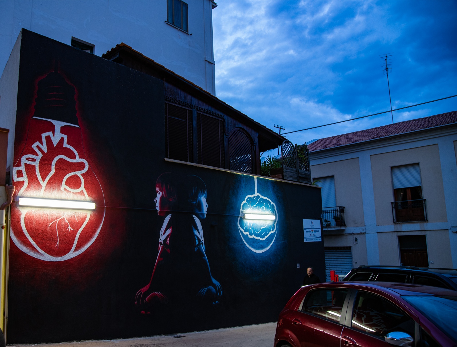 Dall’altra, Antonino Perrotta in arte Attorrep, artista adamantino, founder e art director del festival OSA – Operazione Street Art; tipico dei suoi monumentali interventi urbani è il grande realismo delle figure, sovrapposto a sagome monocromatiche, i cui toni s’incrociano e compenetrano tra di loro.