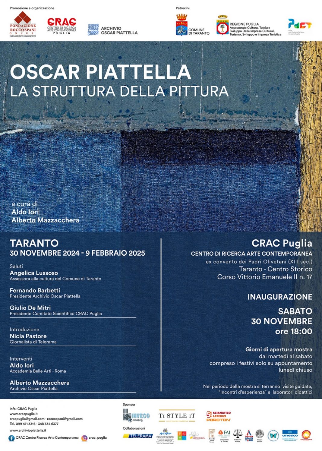Sabato 30 novembre p.v. alle ore 18.00 negli spazi museali del CRAC Puglia (Centro di Ricerca Arte Contemporanea) della Fondazione Rocco Spani Onlus avrà luogo l'inaugurazione della mostra retrospettiva del celebre maestro Oscar Piattella (Pesaro, 1932 – Urbino, 2023) curata dai critici Aldo Iori e Alberto Mazzacchera.