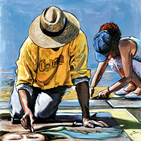 Nell’ultimo ciclo pittorico “Ground” Oscar Piovosi racconta la vita e il lavoro degli artisti di strada, i cosiddetti madonnari, che ritrae intenti nella realizzazione delle proprie creazioni.