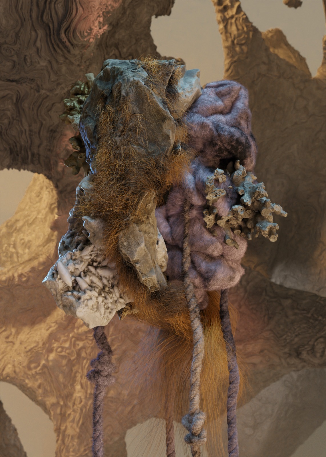 Le opere in mostra raccontano questi incontri ibridi tra linguaggio ed esperienza sensoriale, contenuti ancestrali e tecnologie contemporanee, mondo animale e vegetale, organico e meccanico, nella forma di disegni e light boxes che racchiudono immagini elaborate dall’artista, ambigue tanto nella forma che nella tecnica adoperata per crearle. Una scultura fatta di frammenti tessili intrecciati (“Codex. A Thousand Years of Nonlinear History”) evoca la stessa realizzazione dei quipu, ma si caratterizza per la commistione di tessuti che provengono da epoche e contesti geografici diversi, intessuti insieme a suggerire l’assenza di ogni gerarchia tra le culture materiali e una storia non lineare ma potenzialmente circolare e infinita, fatta di innesti e connessioni inaspettate.