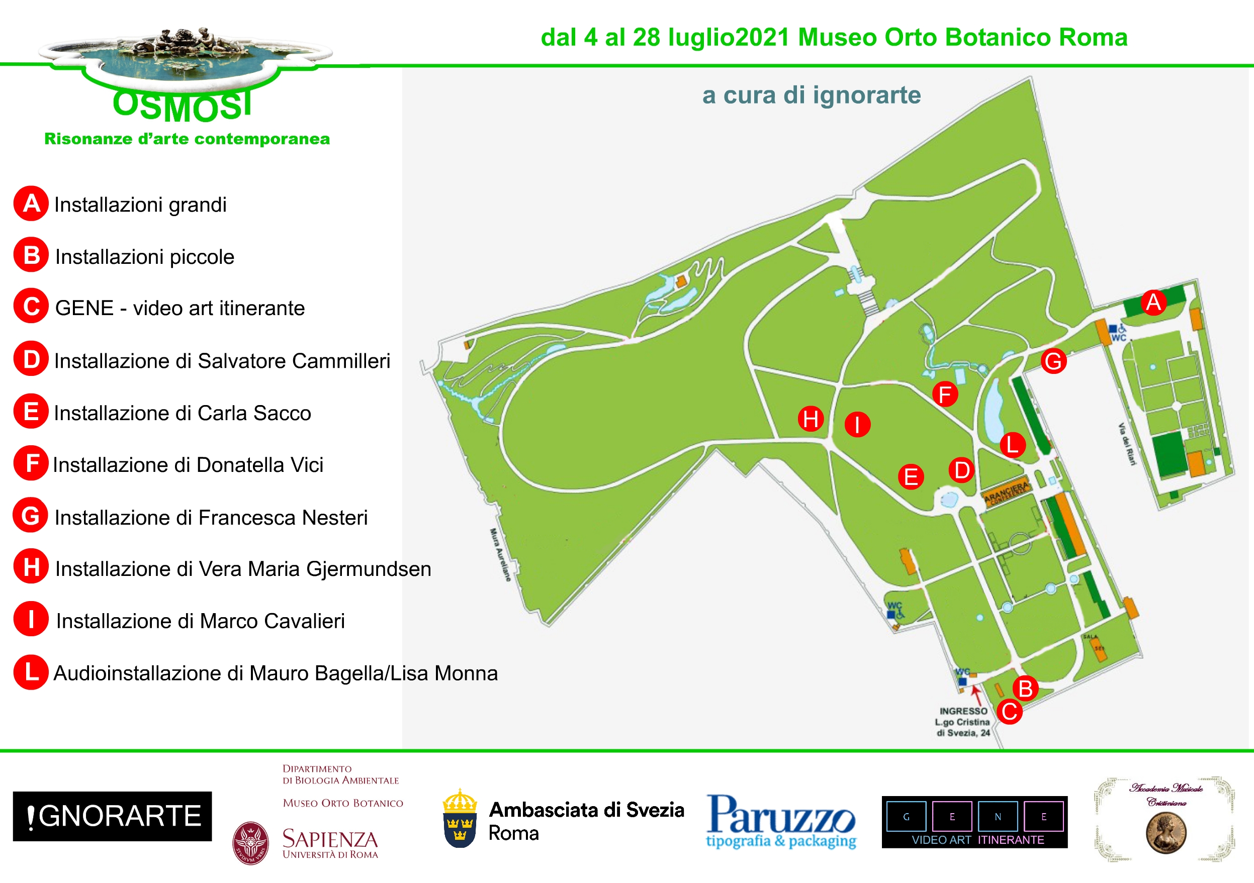 Ignorarte presenta “OSMOSI – Risonanze d'arte contemporanea”. Ciascuno degli artisti partecipanti presenterà tre installazioni artistiche che dialogheranno con i luoghi interni ed esterni dell'Orto Botanico. “Osmosi”, termine che ben definisce una contaminazione naturale. L'arte contemporanea prende in prestito tale processo come metafora, contaminando, attraverso i suoi linguaggi, gli ecosistemi dell'Orto Botanico, senza alterarne la struttura, ma arricchendone la percezione sensoriale. Un'invasione di immagini e suoni che creerà armonici contrasti tra gli equilibri della natura ed il caotico ordine dell'artificio.