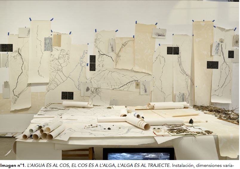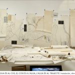 Un grande tavolo accoglie il complesso progetto di investigazione di Francisco Navarrete Sitja sulla relazione tra l’acqua e lo sviluppo della presenza umana dal titolo L’Acqua è per il Corpo, il Corpo per le Alghe, l’Alga per il Sentiero. Il lavoro si caratterizza nel tentativo di analizzare alcuni immaginari territoriali legittimati nel carattere simbolico da una certa espressione materiale dell’ambiente. In relazione a ciò, quando l’autore si interroga sui materiali trovati (rocce, minerali, acqua, falesie e alghe…) ciò che prova ad indagare sono le presenze non-umane come fattori abilitanti di nuovi orizzonti di significato rispetto a come comprendiamo, esercitiamo e ci rapportiamo all’ambiente.