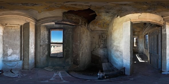 In realtà non si tratta di mere invenzioni ma trasformazioni di luoghi reali ripresi da una serie di scatti fotografici che li percorrono a 360 gradi in senso sia orizzontale che verticale. La somma di questi genera, attraverso ad una specifica rielaborazione, un’immagine virtuale che “spiega” lo spazio nella sua interezza sulla superficie bidimensionale della fotografia. Il luogo oggettivo sfuma così dentro a una dimensione irreale nella quale si perde ogni centralità e la sicurezza delle linee rette lascia il campo a un mondo curvilineo.