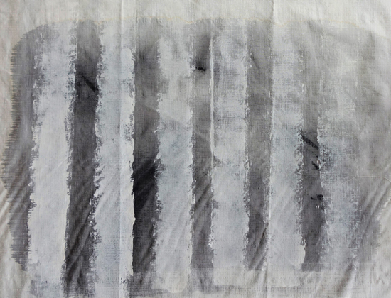 “La mostra propone tredici tele dalle forme occasionali sostenute con chiodi o puntine su supporti che