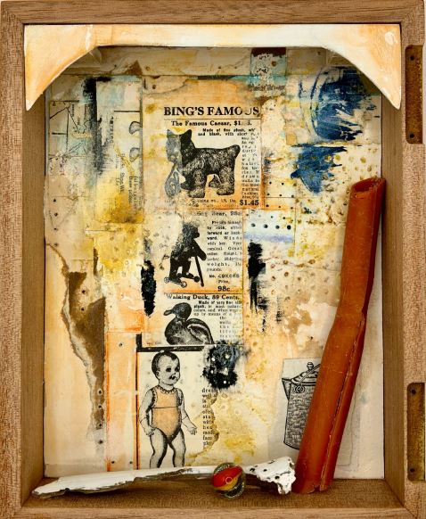L’artista, che vive e lavora negli USA, utilizza scatole in legno di sigari cubani, che trasforma in microcosmi tridimensionali, piccoli teatri sospesi tra incanto e inquietudine, assemblati con oggetti più disparati: carte da parati consunte, illustrazioni vintage, fotografie, frammenti di vita