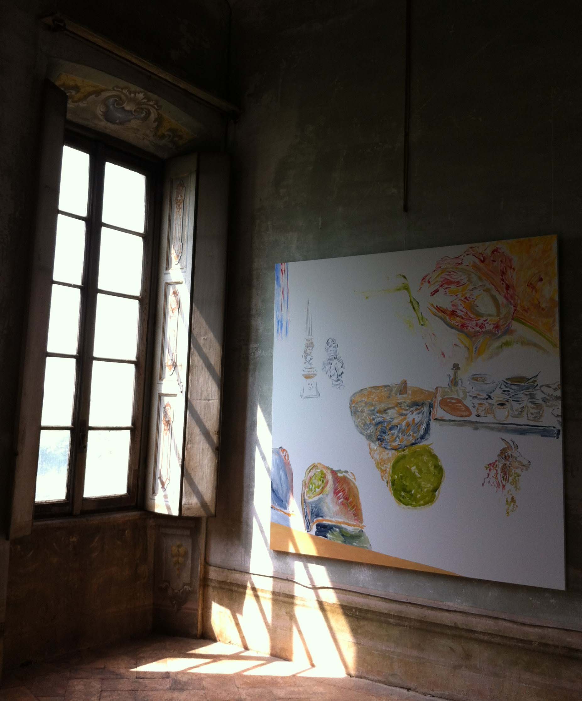 In un’atmosfera verde acqua, le tele architettoniche di Antoni Taulè giocano con lo spazio e ne raddoppiano le prospettive. I dipinti luminosi di Varozza, grazie alla loro tecnica particolare, sottile incontro di acrilico e pastello, donano l’illusione sulle pareti di essere parte di quegli affreschi presenti da sempre. Allusioni alle sculture del parco della villa completano questa delicata illusione.