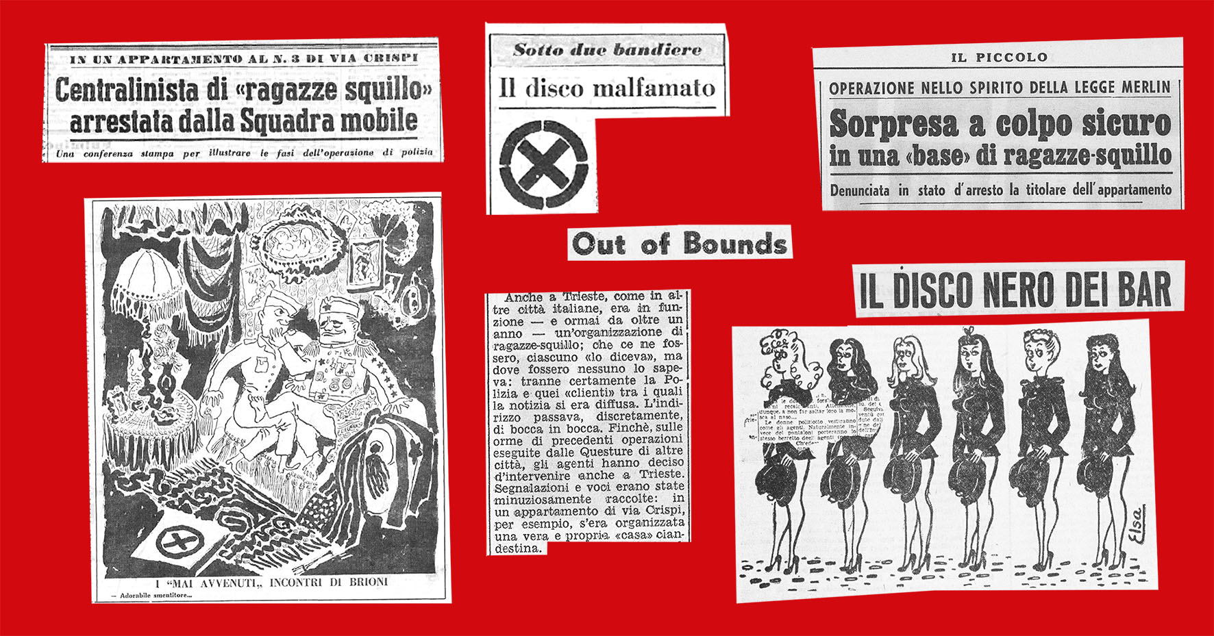 «La grande industria del vizio si è scissa in numerosi rivoletti di modesto artigianato» e Trieste entra nelle cronache della stampa dell’epoca per il proliferare di affitacamere ad ore, per i prezzi esosi di alcune stanze affittate in Cavana, per i «loschi amministratori di stabili» e per uno dei primi grandi scandali, nel 1959, delle «ragazze squillo».