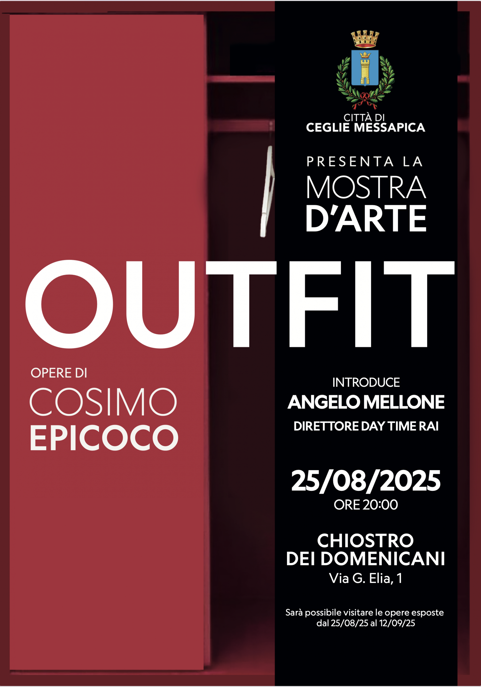 “OUTFIT”, mostra personale di pittura di Cosimo Epicoco, artista nato a Ceglie e da molti anni attivo a Roma. nella suggestiva cornice del Chiostro dei Domenicani, in via G. Elia a Ceglie Messapica (BR). A Cura Angelo Mellone, giornalista e scrittore, Direttore Day Time di RAI UNO.