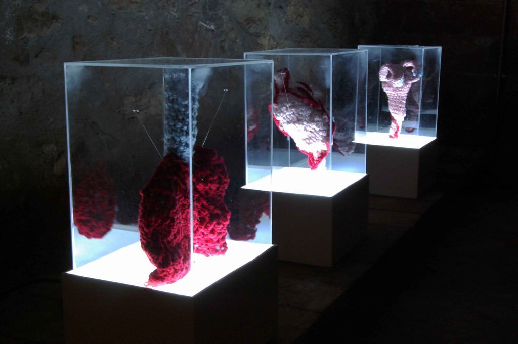 Le opere di Maria Carmela Milano rappresentano delle parti del corpo umano, degli organi, dei lembi di pelle. Ne imitano determinati rumori, come quello di un battito cardiaco o quello di un respiro. Le sue opere, però, sono fatte di lana, di feltro, di cotone e sono cucite a mano coi ferri o all’uncinetto. Messe una accanto all’altra, rappresentano il suo sguardo sul mondo nel quale viviamo e su quelle logiche che regolano le nostre vite.