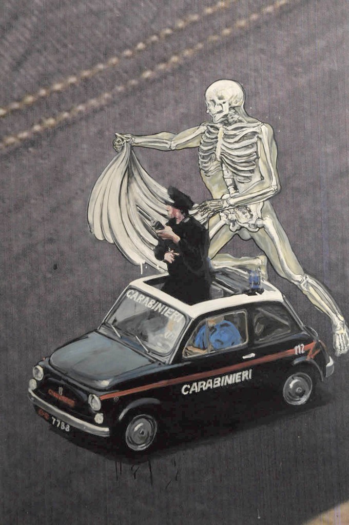 Un’armonica sintesi visibile anche nelle tele esposte in mostra, che spazia dal fumetto alla pop art, dall’arte alla pubblicità, dall’iconografia underground a quella nobile dell’arte classica, dal cinema alla tv fino al web e al graphic design, senza dimenticare la tradizione muralista-monumentale italiana (Sironi docet).