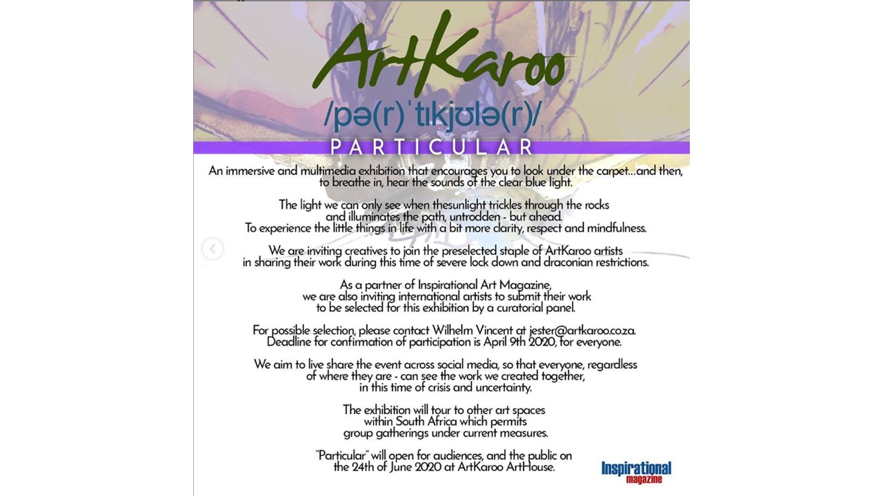 Una mostra multimediale, presentata dalla galleria sudafricana ArtKaroo, che ha sede a Oudtshoorn, e curata da Wilhelm Vincent. Inizialmente destinata ad essere una mostra collettiva tradizionale (prima che la realtà del lockdown calasse sulla nostra realtà), "Particular" continuerà come previsto, anche se con un paio cambiamenti organizzativi. Con una preselezione di artisti di ArtKaroo e ospiti locali e internazionali, "Particular" offre agli spettatori uno spazio per vedere la luce. Molte persone, in questo momento di grande preoccupazione, sono così concentrate su tutto ciò che sta accadendo intorno a loro che tendono a dimenticare di guardare in basso. ArtKaroo e Vincent esortano gli spettatori a "guardare in basso" e sperimentare le piccole cose nella vita con un po' più di chiarezza, rispetto e consapevolezza. Gli spettatori possono aspettarsi esplorazioni intorno a questi temi, nonché interpretazioni derivanti dal concetto di confini, autoisolamento e panico / pandemia.
