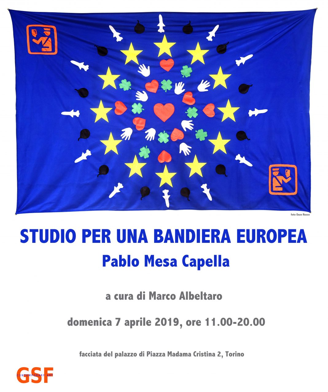 GSF Contemporary Art è lieta di comunicare che domenica 7 aprile, sulla facciata del palazzo di Piazza Madama Cristina 2, a Torino, sarà esposta l’opera di Pablo Mesa Capella intitolata “Studio per una bandiera europea”.