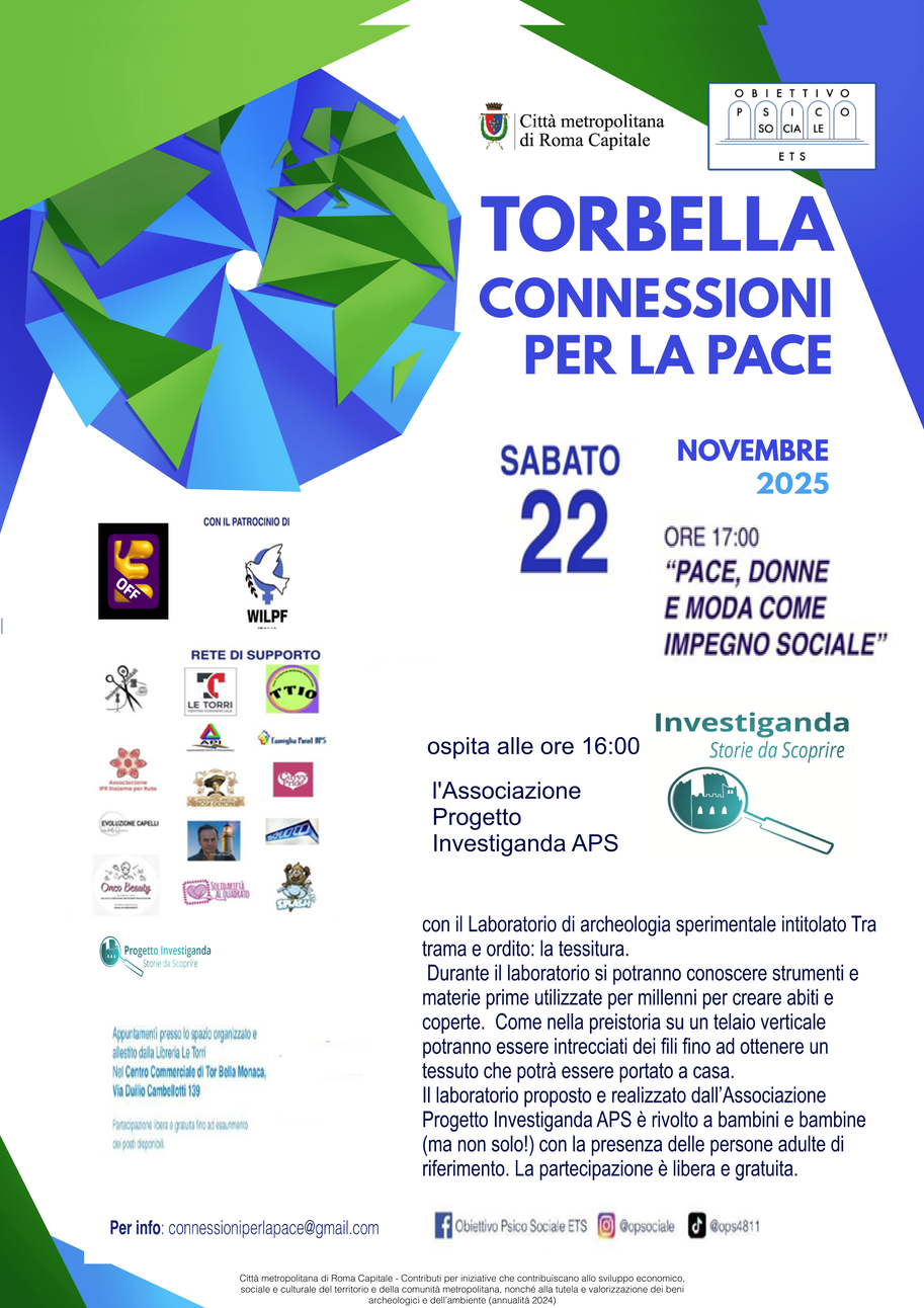 Un evento culturale composito con la presentazione del libro di Elisabetta Bertolotti, un défilé e pensieri per la Pace e un laboratorio di archeologia sperimentale intitolato “tra trama e ordito: la tessitura” nell’ambito del progetto TORBELLA, connessioni per la Pace