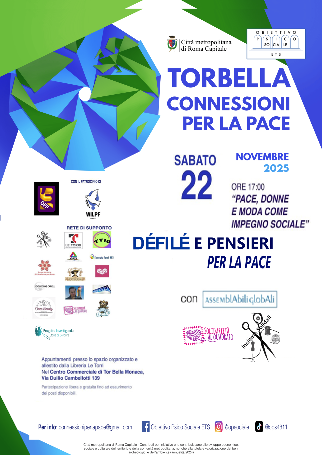 ore 17:00 Défilé e pensieri per la Pace, nello spazio del Centro Commerciale Tor Bella Monaca, per promuovere il valore dell’educazione alla pace, l’interazione culturale e l’affermazione dell’importanza della convivenza. Gli abiti e gli accessori sono realizzati dai Gruppi Solidarietà al Quadrato, coordinato da Piera Cottone e Insieme Solidali coordinato da Patrizia Corona, delle Associazioni AssemblAbili GlobAli OdV e Obiettivo Psico Sociale ETS. Partecipano modellɘ non professionistɘ che propongono un modo alternativo di affrontare le esperienze negative basato su percorsi di consapevolezza promossi e sostenuti dalla rete di relazioni solidali significative.