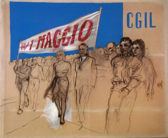 Nel 1952 ho lavorato alla “Guida del Lavoratore Agricolo”, era la rivista della Federbraccianti, veniva fatta a Bologna dove un intellettuale di grande rilievo come Luciano Romagnoli la dirigeva. Intellettuali, artisti, lavoratori, a quel tempo, costruivano assieme le cose. In quegli anni, ed e’ proseguito per un certo periodo, il blocco di forze che aveva fatto la Resistenza lavoravano assieme e avevano dimenticato di appartenere a spezzoni diversi. Rivedere oggi, a distanza di tanto tempo, questi lavori che sono nella collezione della CGIL, fatti da artisti, e’ bello; non sono lavori di propaganda, c’e’ grande tensione poetica. Vedi i lavoratori erano importanti, avevano fatto la Resistenza e stavano facendo l’Italia.