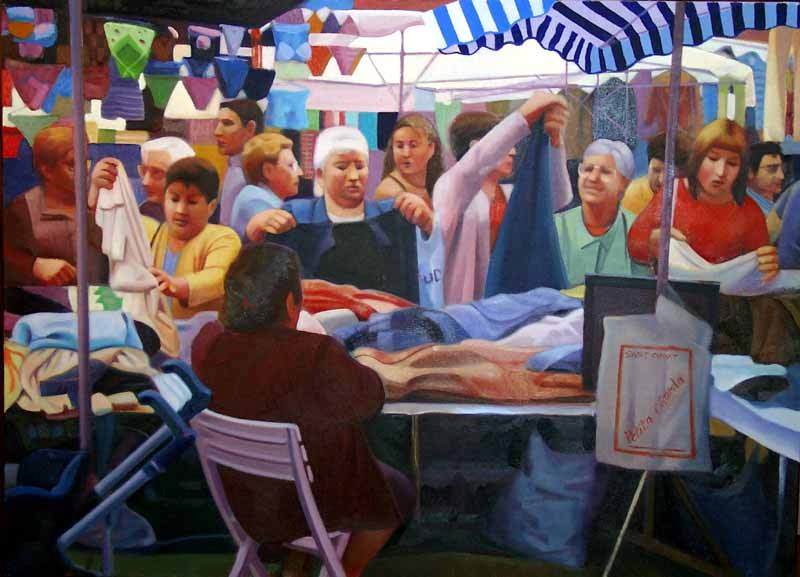 Nello stesso modo il pittore Andaluso, catalano d’adozione, vaga per le città (Jaen in Andalusia, o Barcellona) alla ricerca di questi momenti magici, che lui definisce “Miracoli quotidiani”; gli capita così di scoprire un momento di riposo al parco di una donna incinta col bimbo piccolo intento a giocare e di condividerne l’assoluta serenità; o di cogliere l’espressione magicamente intenta di una ragazza ferma al semaforo col suo motorino. Spesso la sua vena da illustratore irrompe sulla scena volgendo i suoi “miracoli” in chiave benevolmente surreale, come quando fa “volare” dei vecchietti sui fili della luce, oppure quando vede una coppia di angioletti che suonano ed accompagnano i fedeli all’uscita della messa.
