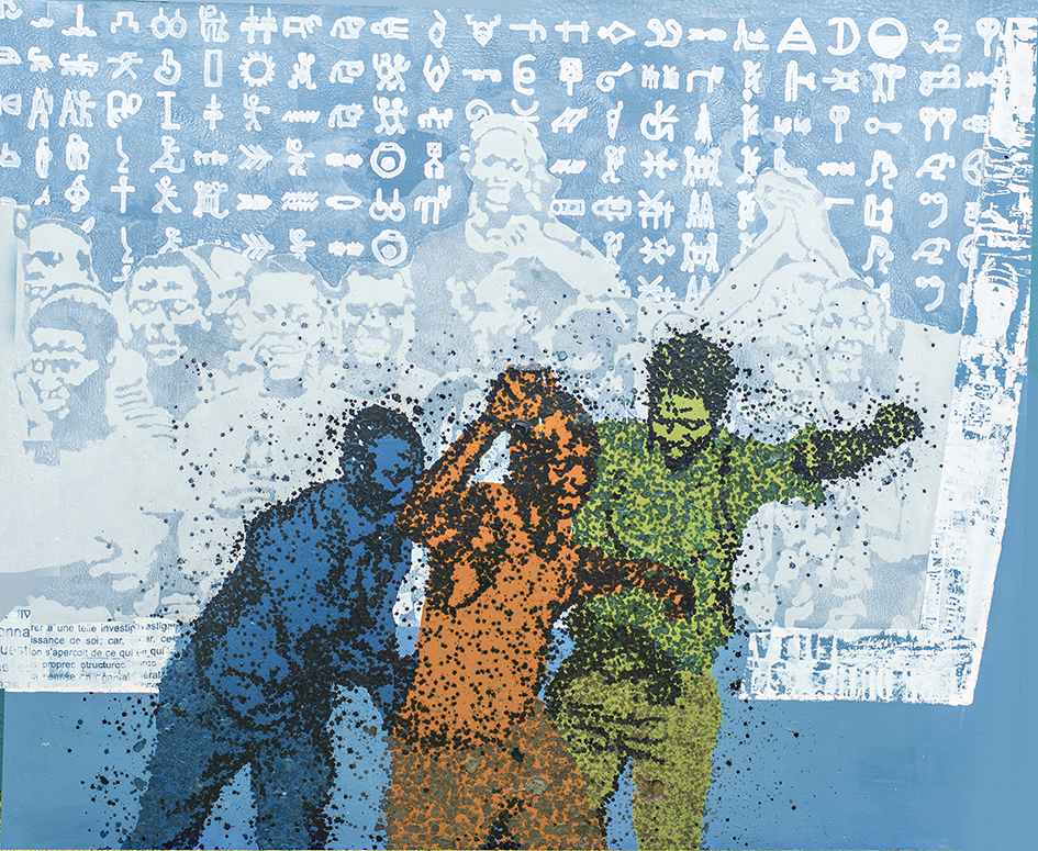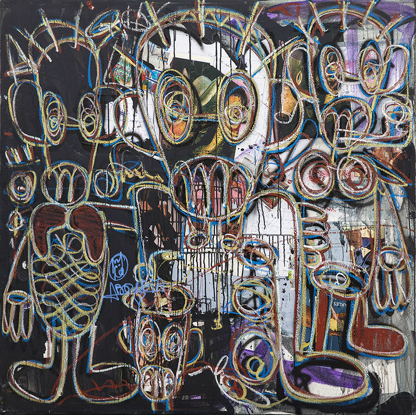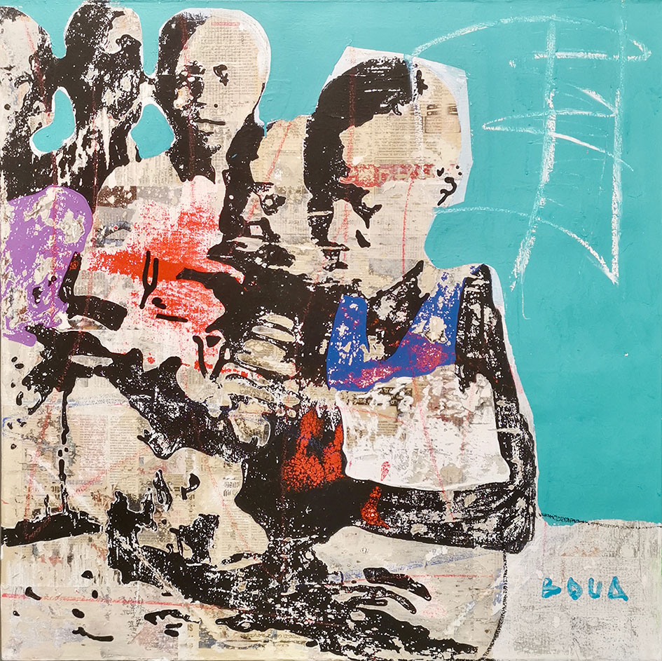 Aboudia, nato ad Abidjan in Côte d’Ivoire nel 1983, vive e lavora tra Abidjan e New York, esprime una società̀ africana lacerata nel tessuto sociale in cui i giovani forniscono nuova linfa vitale. Dipinti taglienti composti da volti contrastanti, sfumature erotiche e ritagli di giornale in cui emerge la vita urbana attuale. Auto, grattacieli, televisori, fotografie e frasi scritte che ricordano l'arte di strada forniscono una sinfonia visiva il cui ritmo è il ritmo della vita.