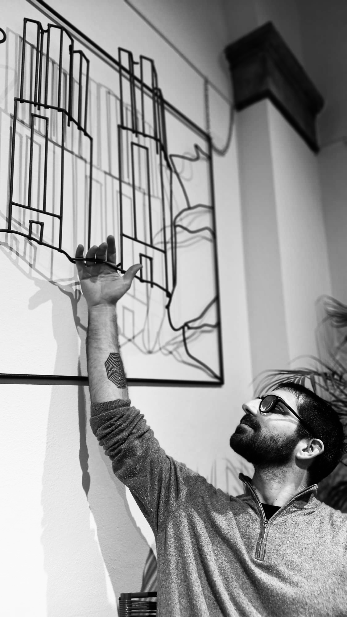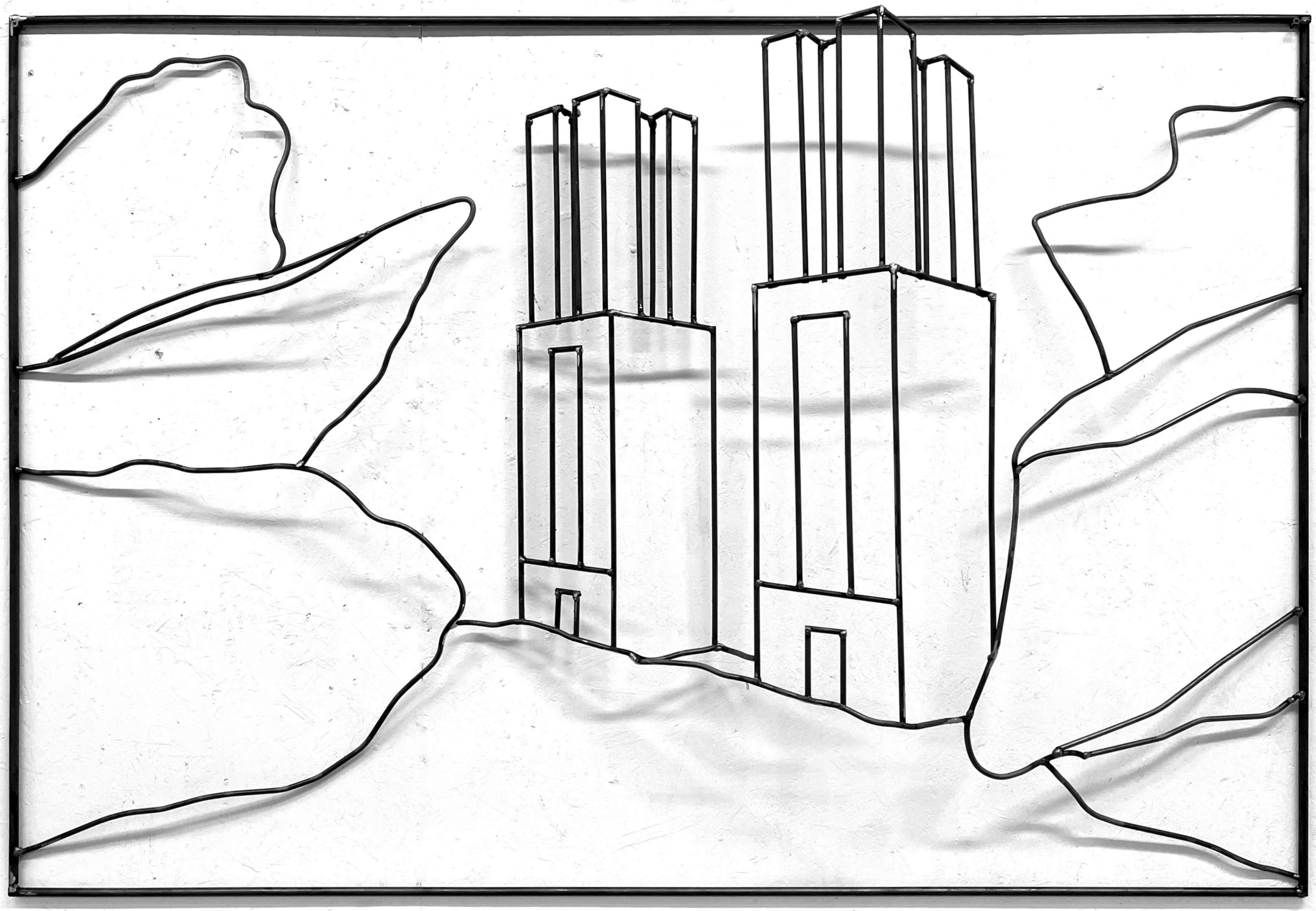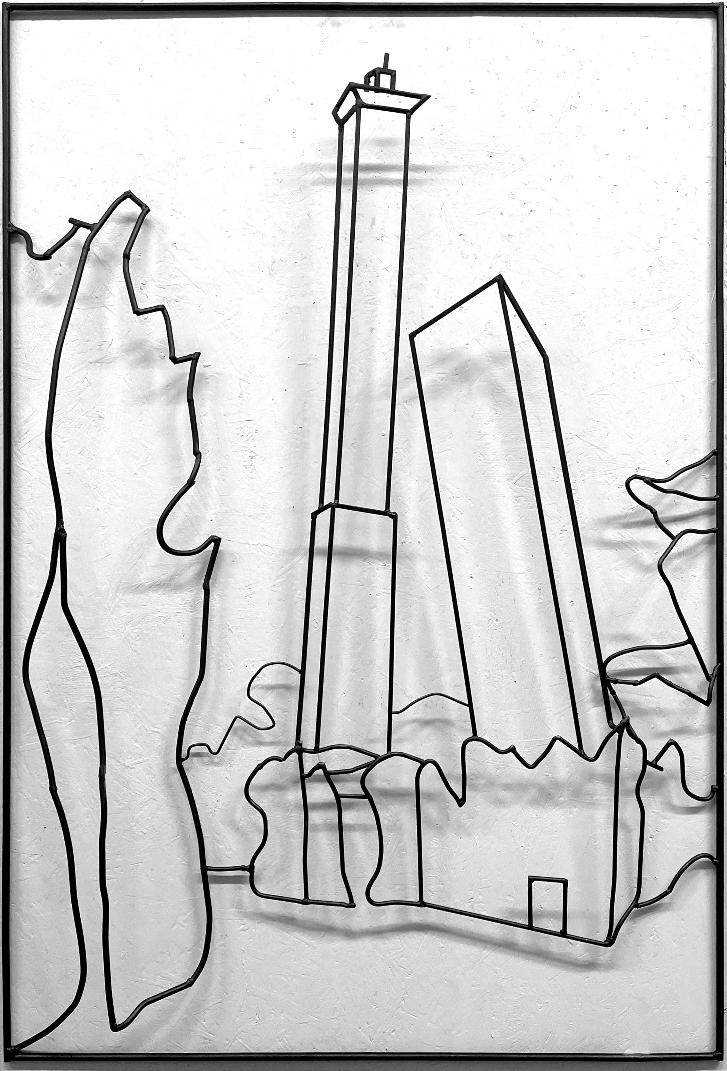 Nella serie “Paesaggi Immaginari”, l’artista traduce la solidità del ferro in un gesto di leggerezza, delineando con linee sottili e geometriche luoghi e monumenti che appartengono alla memoria collettiva. Questi “quadri di ferro” sono mappe mentali, architetture sospese tra realtà e immaginazione.