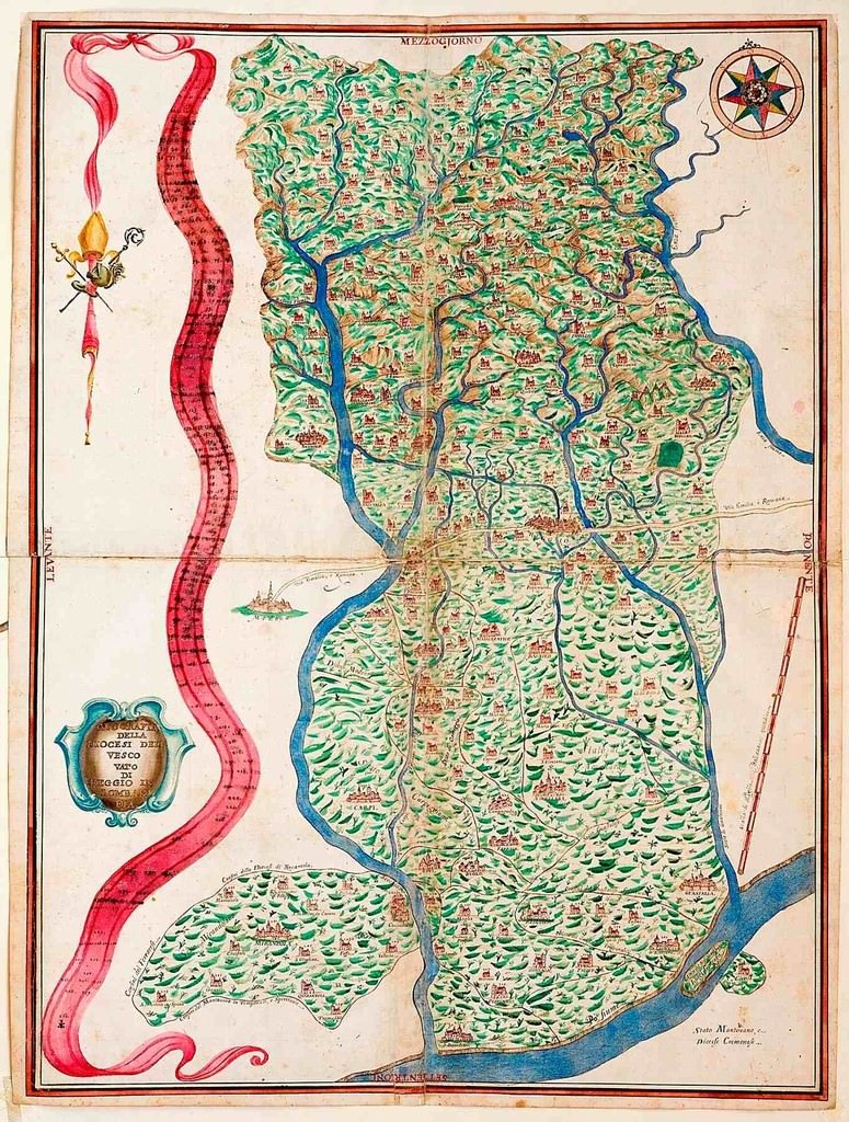 In Palazzo Magnani ottanta tra mappe e documenti cartografici dal ‘500 all’800 illustrano i caratteri originali e specifici del territorio della provincia di Reggio Emilia e compiono una riflessione critica sull’evoluzione nel tempo del linguaggio cartografico