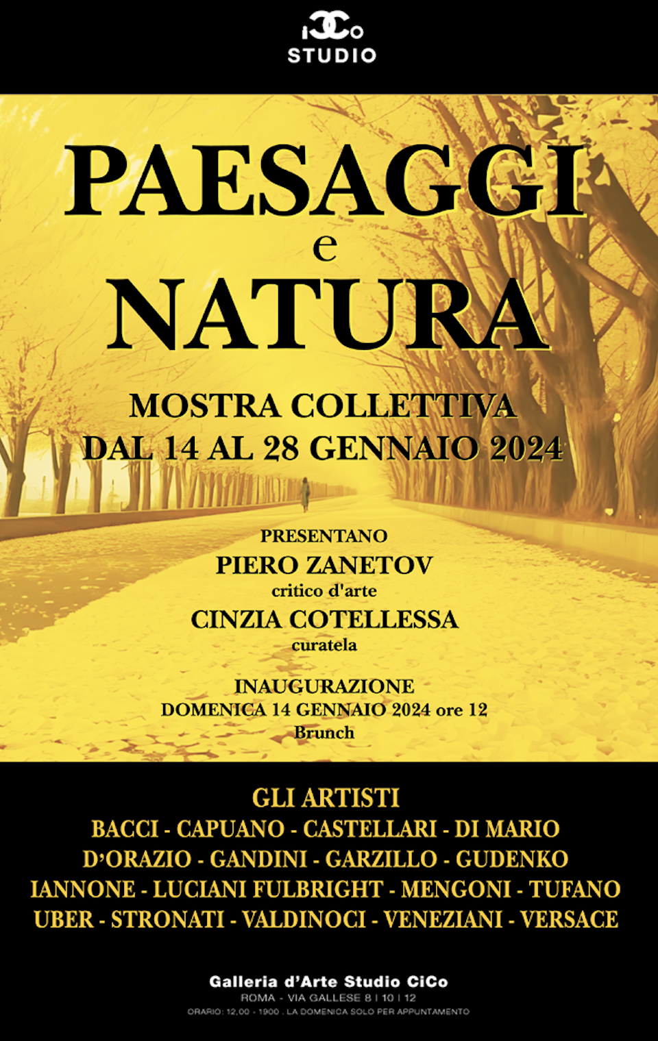 Domenica 14 gennaio 2024, alle ore 12, la Galleria Studio Cico, sita in Roma, via Gallese 8, è lieta di inaugurare la mostra collettiva "Paesaggi e Natura", con la curatela della gallerista e artista Cinzia Cotellessa.